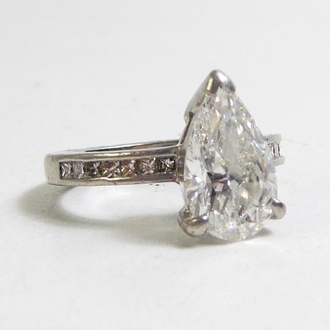 Dråbe højde ca. 11,5 mm, bredde ca. 7,5 mm, svarende til ca. 2,5 carat. Ringstørrelse 48,5. Stemplet 'PT950' samt engelske platinstempler.