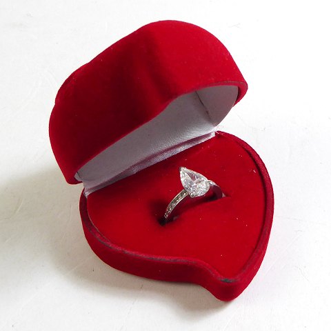 Dråbe højde ca. 11,5 mm, bredde ca. 7,5 mm, svarende til ca. 2,5 carat. Ringstørrelse 48,5. Stemplet 'PT950' samt engelske platinstempler.