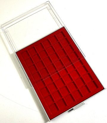 Lindner System møntboks med 48 ligesidede fag til mønter eller medaljer med en diameter på op til 30 mm.