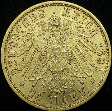 Tyskland, Württemberg, 20 mark 1894-F 'Wilhelm II', KM# 634, GULD