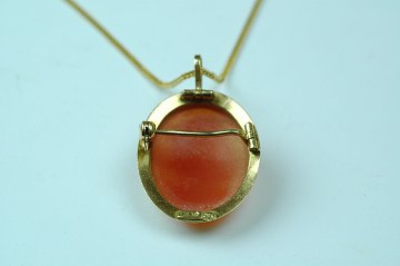 Vedhæng af guld 18 kt prydet med came. Vedhæng monteret med nål så det kan anvendes som broche. Kæde af gulddouble.