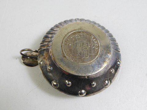 Tastevin (vinsmagningskop) med ukendte sølvstempler, blandt andet lødighed '916'. Bredde ca. 9,4 cm (uden hank). Ilagt Spansk 8 Real fra 1796.