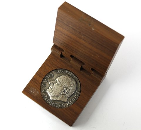 Medaille præget i anledning af Kong Olav V 70 års fødselsdag i 1973. Diameter 50 mm, vægt 72 gr. Original salgsæske af træ med guldtryk medfølger.