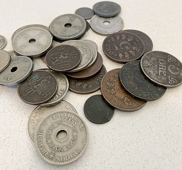 1 øre 1889, 1906. 2 øre 1893, 1902, 1906, 1907. 5 øre 1876 (2), 1878, 1899, 1907, 1913, 1919 jern. 10 øre 1878 (slidt), 1945 zink, 1949. 25 øre 1924 (2), 1929. 50 øre 1926 (2), 1942 zink, 1944 zink, 1948. 1 kr. 1925 (3), 1927 (2), 1938 (2), 1950, 1955, 1958. Der medfølger 2 Skilling Courant 1811 (meget slidt).