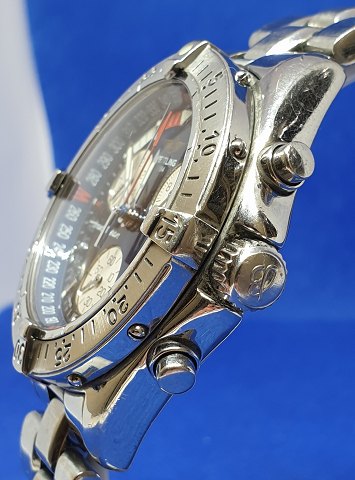 Med højkvalitets quartzværk. Kasse og lænke af stål. Fluorescerende visere. Med kronometerfunktion.