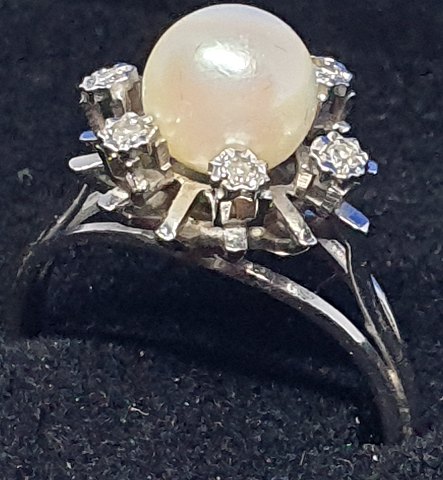 Hvidguldring med perle og 6 diamanter, 0,12ct