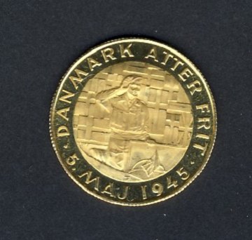 Lille medaille af guld 21,6 kt. Slået til minde om danskere der faldt under 2. verdenskrig. 3,5 gram