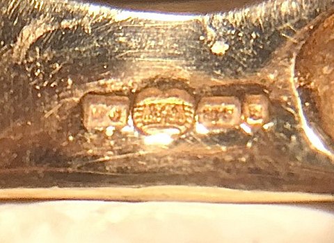 Ringstørrelse 51. Stemplet med engelske guldstempler heriblandt '375' i en vægt.