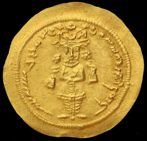 Khusro II (591-628 AD). AV dinar (27 mm, 4,15 g,). Usikker mynte, regnal år 36 (625 AD). Göbl VI/7, pl. 14, 221. Paruck 460. Sunrise Collection 989