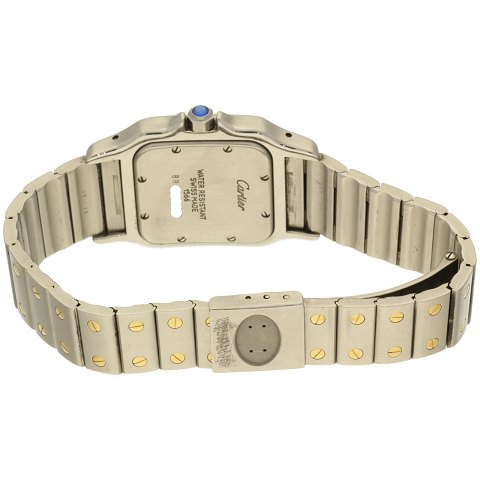 Cartier Santos Quartz unisex armbåndsur, ref. nr. W20012C402 i urkasse og med foldelænke af totonet stål. Optrækskrone prydet med cabochonsleben, blå safir. Rektangulær skive bag mineralglas med romertal, central sekundviser og datovisning i #3 position. Quartzværk. Urkasse 24 x 34 mm.