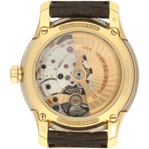 Omega DeVille Coaxial Hour Vision Automatic herearmbåndsur, ref nr. 43163412113001 med kasse og foldespænde af 18 kt. rosé-guld. Chokolade-brun skive med stregindeks og datovindue i tredje indeks. Omega Coaxial caliber 8501 med hele 60 timers gangreserve. Urets kasse har en diameter 41 mm og er monteret på en mørk brun læderrem med foldespænde af 18 kt. rosé-guld.