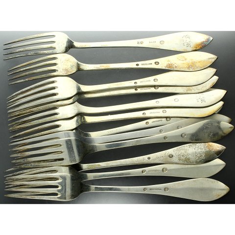 Velholdt Empire bestik af sølv bestående af 12 middagsgafler, 12 middagsskeer, 12 middagsknive, 4 pålægsgafler, 2 sauceskeer.