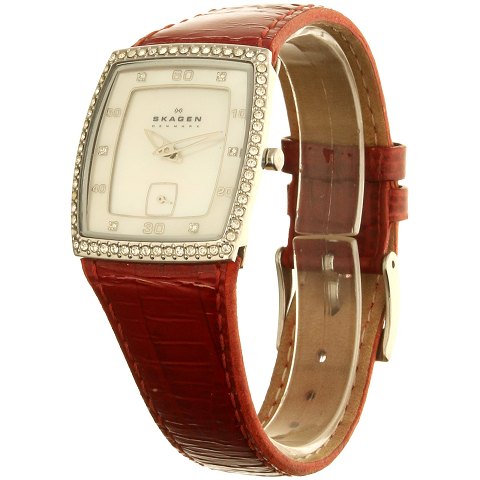uret har en lys perlemor-skive og en 27x30mm kasse af stål, kassen er monteret på en rød læderrem med dorn-spænde. uret er udstyret med et quartz urværk.