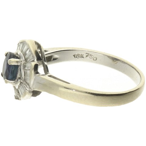 Ring af hvidguld 18kt. fattet med oval safir ca. 0,25ct. og tapered baguette cut diamanter ca. 0,27ct.