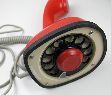 Svensk retro fastnettelefon, lanceret i 1950'erne af L.M. Ericssson under modelbetegnelsen Ericofon, med drejeskive i bund. Denne røde udgave af telefonen "Cobra" er velholdt med intakt og ubeskadiget gummiring i bunden.