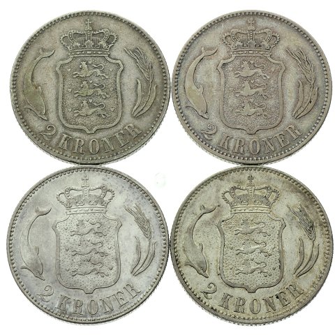 Christian IX og X - 2 kroner 1875+76+15+16 - sølv