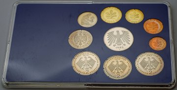 Tysk møntsæt, hvor mønterne er slået i proof-kvalitet, bestående af: 1, 2, 5, 10 og 50 pfennig samt 1, 2(3) og 5 mark.