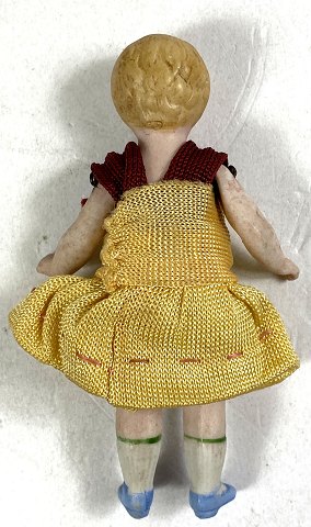 Dukke af porcelæn iklædt gul kjole med røde stropper.