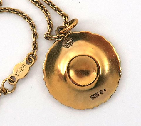 GJ vedhæng af forgyldt sterling sølv med hvid emaillebelægning, diameter 18 mm., ankerkæde af forgyldt sterling sølv, L. 44 cm.