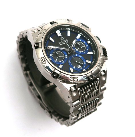 Festina chronograph herrearmbåndsur, ref. F 16774 i urkasse og med foldelænke af stål. Sort skive med blå features bag mineralglas med stregindikation, central- og separat sekundviser, datovisning i #6 position samt chronograph funktion. Quartsværk, urkasse diameter 43 mm.