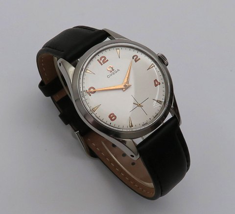 Omega 1954 Vintage herrearmbåndsur, ref. nr. 2750.6 i urkasse af stål. Lys gråhvid skive med arabertal og stregindikation, separat sekundviser. Manuelt mekanisk optræksværk kaliber 266. Urkasse diameter 35 mm. Fornyet urrem med metalspænde.