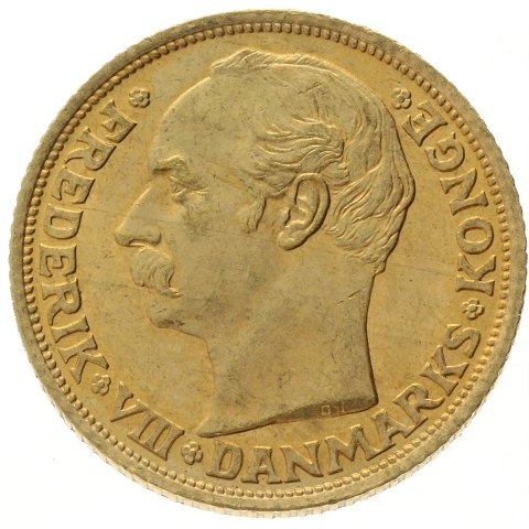 Danmark, Frederik VIII, 10 kr. 1908 guld, diameter 18 mm., vægt 4,4 gr. (.900).