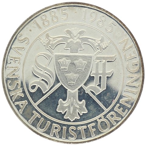 Møntsæt 1971 ’Sista årsset enligt 1873 års lag’ med bl.a. 5 kr. i sølv. Møntsæt 1973. 100 kr. mønt ’Svenska Turistföreningen’ 1885 – 1985.