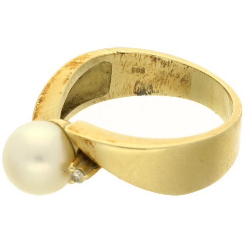 Ring af guld 14kt. fattet med kulturperle samt to små brillanter ca. 0,02