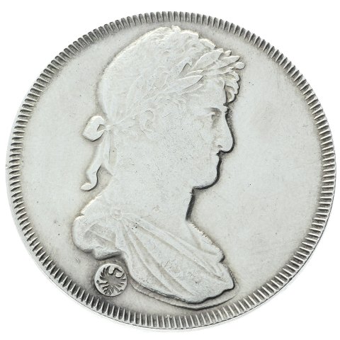 Udmøntet med korrekt Ferdinand VII-portræt, der blev fundet ved mønten, men aldrig blev brugt i sin tid.