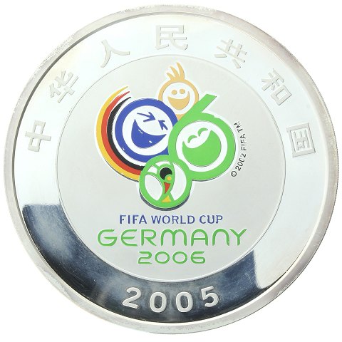 1 kg. finsølv .999 - 300 Yuan, præget i anledning af fodbold verdensmesterskabet i Tyskland 2006. Kun fremstillet i 3000 eksemplarer. Forside dekoreret med emaille belægninger. Diameter 100 mm.