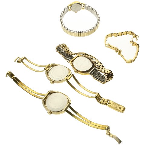 Lot bestående af fire forgyldte damearmbåndsure samt en ur-lænke(5)