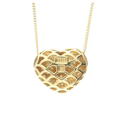 Halskæde af 18 kt. guld med hjertevedhæng, prydet med brillanter 0.12 ct i alt . Kæde L.42 cm., samlet vægt ca. 3.2 gr.