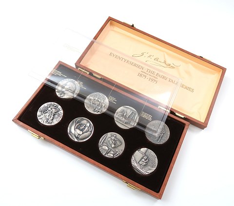 H.C. Andersen Eventyrserien medaljesæt af sterling sølv, præget i anledning af 100 års dagen for H.C. Andersens død i 1875 (1875-1975). Medaljerne er formgivet af Harald Salomon og hver medalje er præget med H.C. Andersens portræt i retningsskiftende position, samt revers med 8 diverse eventyrmotiver. Medaljer diameter 50 mm., Samlet vægt 682 gr. (.925.)