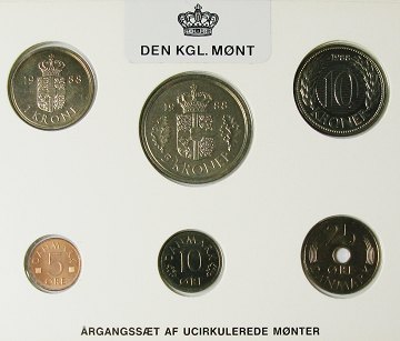 Møntsættet indeholder samtlige mønter i Danmarks møntserie: 10-, 5-, og 1-kr samt 25-, 10- og 5 øre.