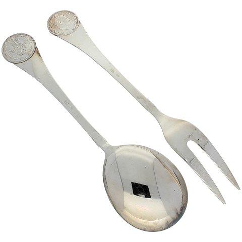 Serveringsske og stegegaffel af sølv begge monteret med mønt i