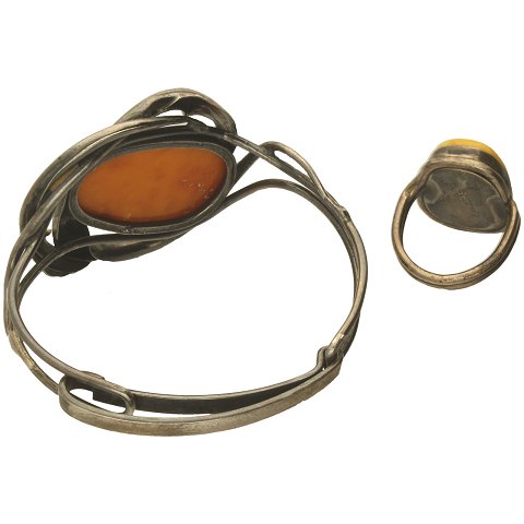 Sæt bestående af armring og fingerring af sterlingsølv med rav