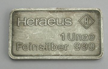 Heraeus sølvbarre, 1 ounce finsølv.