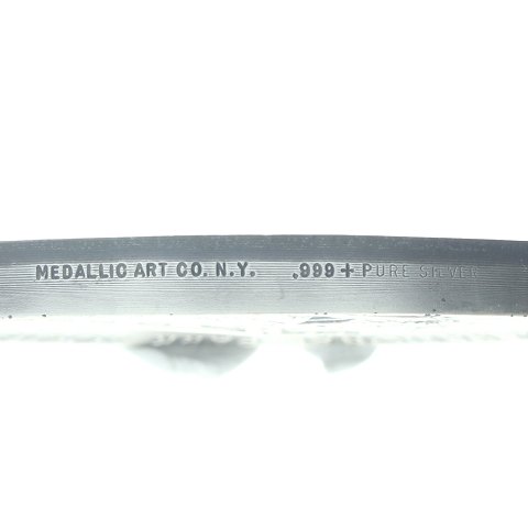 Rebild Medaillon af finsølv, designet af Marshall Fredericks. Medaillon med præg af Abraham Lincolns kopihus i Rebild Bakker. Diameter 70 mm., finsølvvægt ca. 182 gram.
