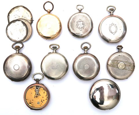 Lot defekte lommeure, heraf 4 af sølv samt beskyttelseskapsel til lommeur og 2 løse bagkapsler af sølv. Urene er reservedelsobjekter.
