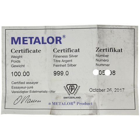 Metalor - 100gr finsølv - sølvbarre med certifikat