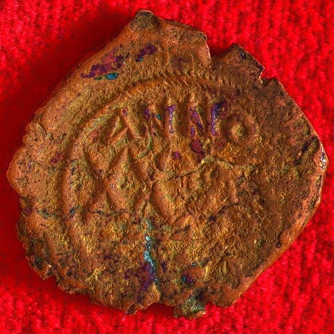 Bronze, præget i Cyzicus, dateret RY 3 (604-605 e.Kr.). Vægt: 11,4 gram. Ca. 32 mm i diameter.