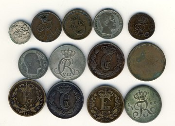 Lille samling af ældre danske mønter - bl.a. 1 skilling 1621, 4 skilling 1807 og 2½ schilling 1809