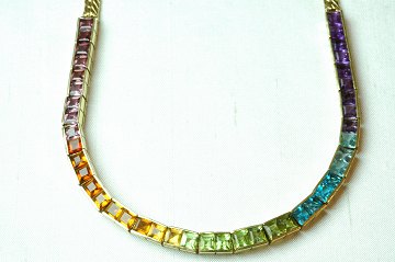 Halscollier af guld 18 kt, prydet med forskellige stene i forskellige farver ametyst, citrin, topaz, akvamarin mm. vægt 25 gr.
