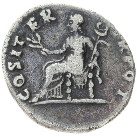 IMP CAESAR VESPASIANVS AVG Laureate head of Vespasian to right. Rev. COS [ITER] TR POT Pax seated left, holding branch in her right hand and caduceus in her left.
