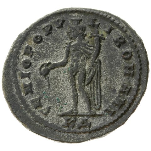 Maximianus AE Follis. 297-299 AD. IMP CMA MAXIMIMANVS P F AVG, laureate head right / GENIO POPVLI ROMANI, Genius standing left pouring libation from patera & holding cornucopiae.