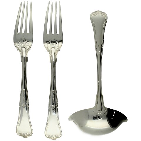 Herregård - sauceske samt to frokostgafler af sølv.