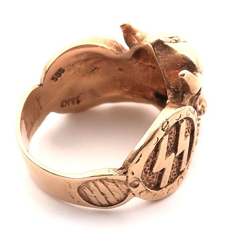 Fremstillet efter III riges sammenbrud. Ring af 14 kt. guld med front i form af vikingehoved, flankeret af dobbelt sigrune og svastika. Ring Str. 65, vægt ca. 17 gr.