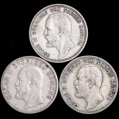 Sverige - 3x 2 Kronor - 1898, 1904, 1907 - Oscar II - Sølv - KM# 761, KM# 773