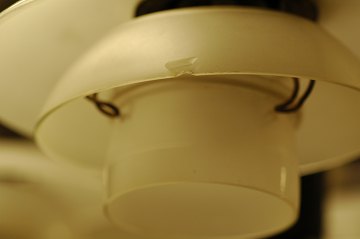Poul Henningsen, 4 armet loftslampe af bruneret metal, hver arm med 3 delt skærmsæt af glas. Af en enkelt del af et skærmsæt er der et lille afslag (afbilledet)