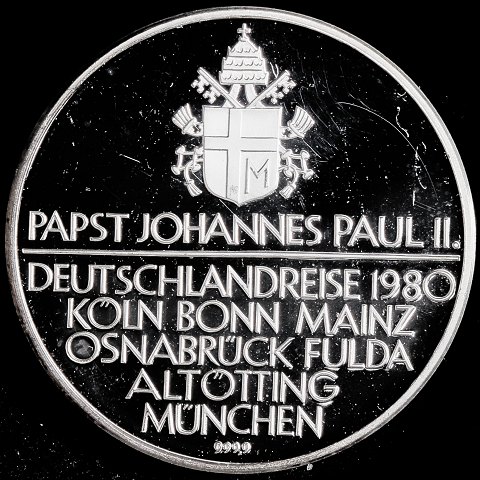 ''Præget i anledning af Paven Tysklandsrejse 1980, hvor han besøgte Köln, Bonn, Mainz, Osnabrück, Fulda, Altötting og München.''